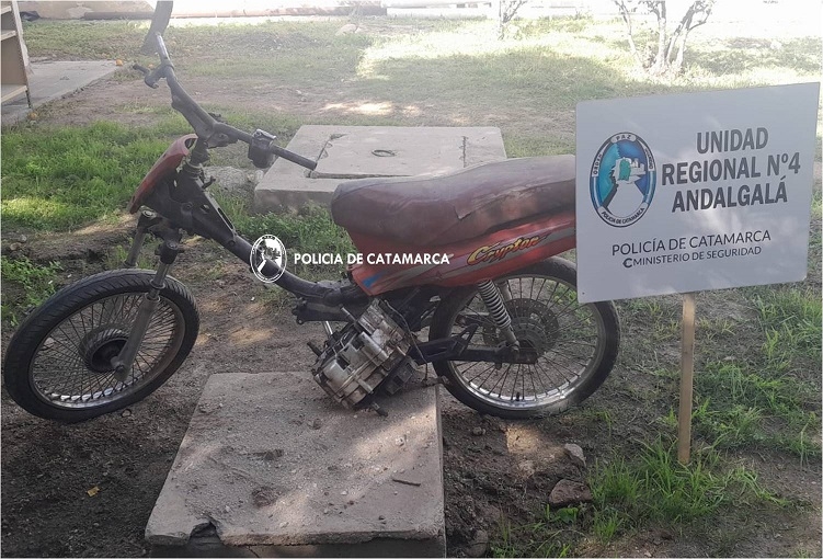 Hoy, a las 11:20, personal de la Comisaría de Andalgalá, conjuntamente con sus pares de la División Sustracción de Automotores de la Policía de la Provincia, llevaron a cabo una inspección en un taller mecánico ubicado en el Distrito Huaco, donde procedió al secuestro de una motocicleta Yamaha Crypton 110 cc.