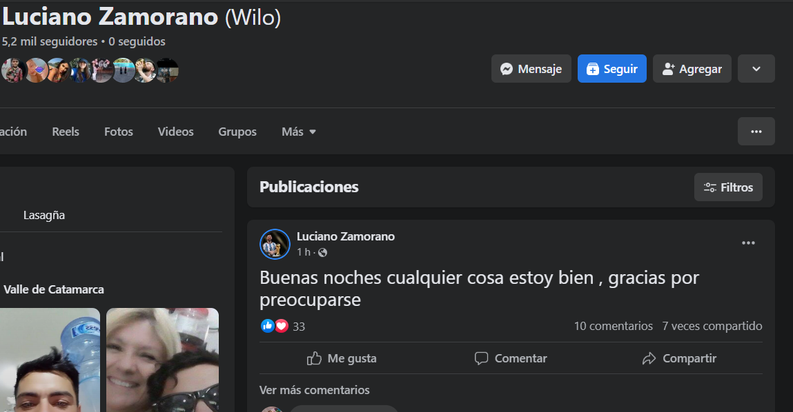 Sin embargo, en un mensaje publicado en su cuenta de Facebook, Luciano escribió que se encuentra bien y agradeció la preocupación de todos. A pesar de esta confirmación, las autoridades continúan trabajando para verificar su estado y determinar las circunstancias de su desaparición.