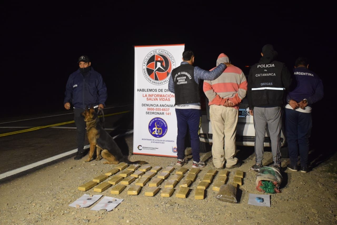La droga fue encontrada en un automóvil Fiat Palio de color blanco en el que circulaban dos personas del sexo masculino de 28 y 49 años de edad, ambos oriundos del departamento Pomán. Al inspeccionar el rodado frente a testigos civiles, los policías encontraron treinta y ocho (38) panes compactados que contenían una sustancia herbácea y una bolsa de plástico blanco que contenía cogollos, que al ser sometidos a la prueba de campo correspondiente arrojó como resultado que se trataba de 31,020 kilos de marihuana que quedaron en calidad de secuestro, al igual que una balanza digital de color celeste, un teléfono celular y la suma de seis mil quinientos pesos ($6.500) en efectivo.