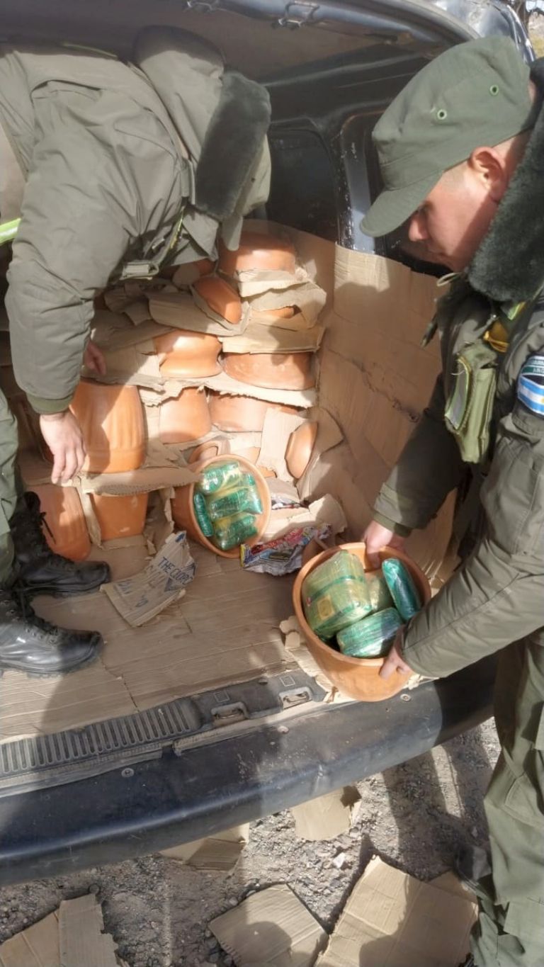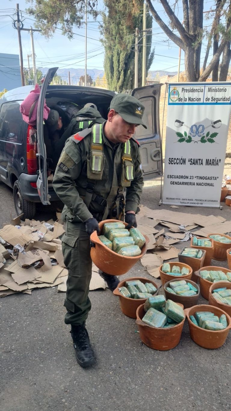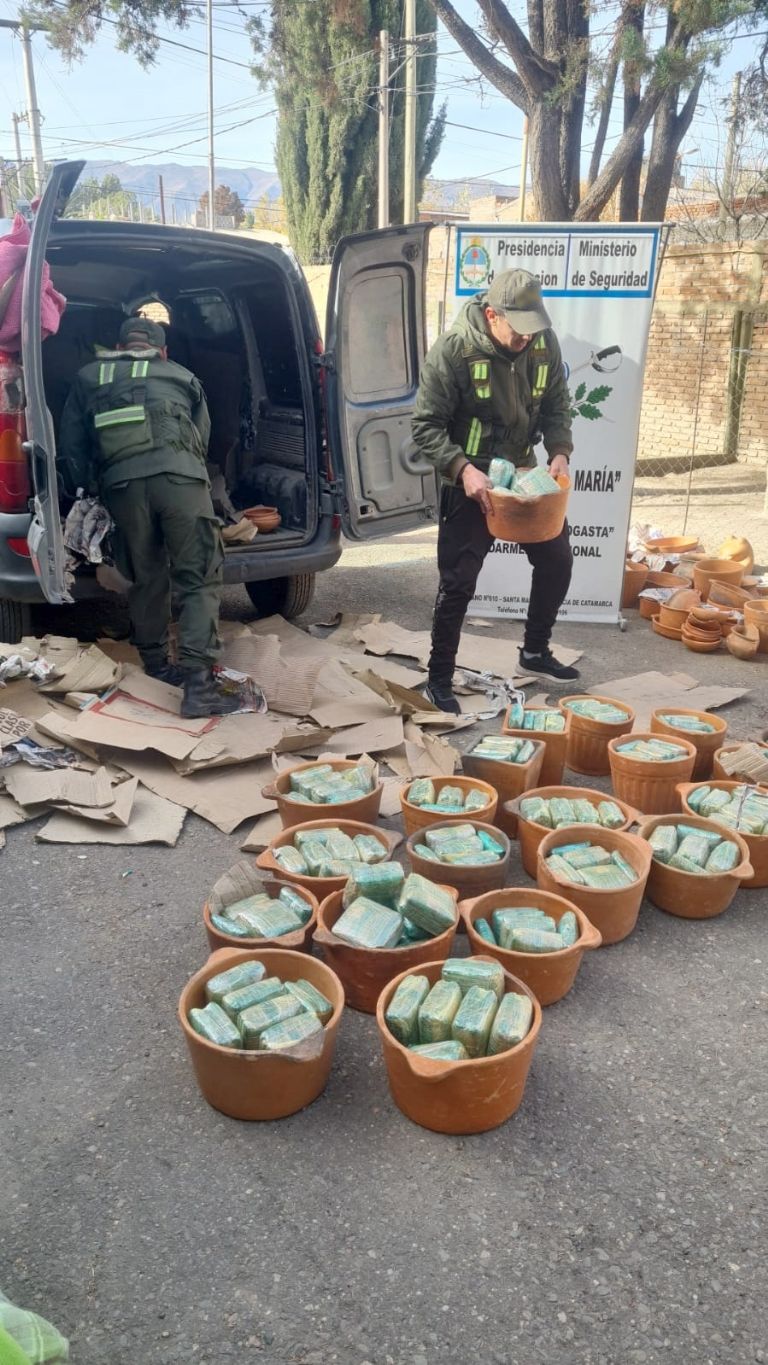 El pasado sábado, se dispuso un operativo cerrojo en forma coordinada con efectivos de la Sección “Santa María” del Escuadrón 23 “Tinogasta” quienes se encontraban sobre la Ruta Nacional N° 40 acceso norte, detuvieron la marcha del utilitario. Durante la inspección, los funcionarios constataron la presencia de paquetes dispuestos en el interior de vasijas de barro, así como también en los paneles laterales del vehículo.