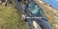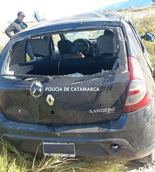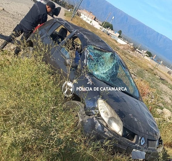 A las 16:05 de hoy, en avenida Atacama, en cercanías al ingreso del barrio Antinaco, Adolfo Ismael Ceballos (28), que circulaba en un Renault Sandero azul, en compañía de Darío Germán Almaraz (36), perdió el control y volcó a un costado de la cinta asfáltica.