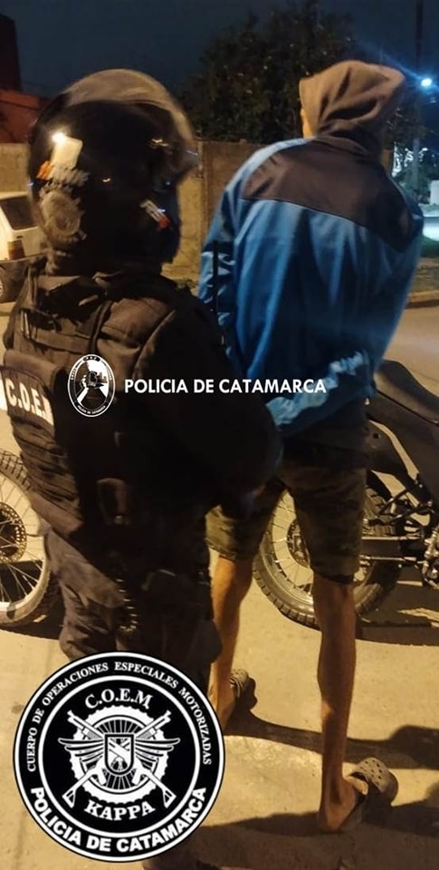 Seguidamente y a partir de las características brindadas, los motoristas realizaron recorridos por la zona y, en la esquina de la calle Alpatauca y Avenida 2 de Abril, aprehendieron al presunto autor del ilícito, un joven de apellido Pintos (23), quien fue trasladado a la Seccional Octava, que corresponde por jurisdicción, donde quedó alojado a disposición de la Fiscalía de Instrucción en turno, en tanto que se invitó al damnificado a denunciar penalmente el hecho en la Unidad Judicial Nº 8