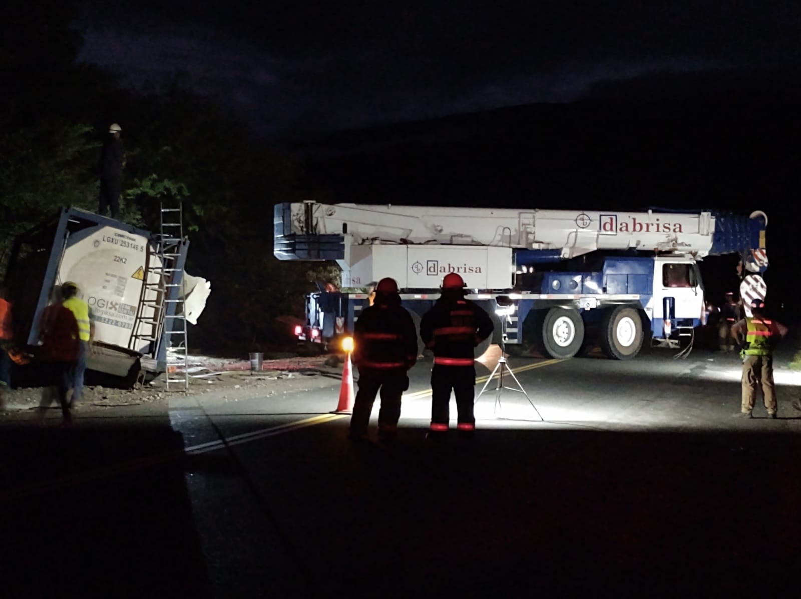 El personal de la empresa encargada de realizar el tratamiento de la peligrosa sustancia consistente en nitrato de amonio líquido, que se usa en los emprendimientos mineros, arribó desde Buenos Aires en horas del mediodía y recién pasada las 21 hs. pudieron realizar el traslado del container siniestrado a otro camión, mediante el uso de una grúa para 90 toneladas oriunda de La Rioja. De esta manera, se movió el contenedor con la carga contenida evitando realizar el trasvaso del producto, lo que representaba un trabajo más arduo y peligroso.