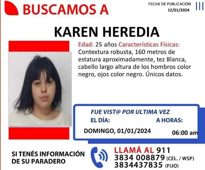 Una joven de 25 años, oriunda de la ciudad de Catamarca, está desaparecida desde el domingo 1 de enero. Fue vista por última vez a las 06:00 am en San Fernando del Valle de Catamarca. Su familia pide colaboración a la población para poder dar con el paradero de Karen.