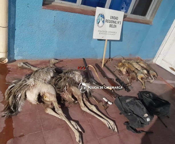Durante el procedimiento, los Policías incautaron una escopeta calibre 16, una carabina calibre 22, ocho cartuchos de los calibres mencionados, un arma blanca y dos mochilas negras, que en su interior contenían cuatro liebres y dos suri, ambas especies protegidas.