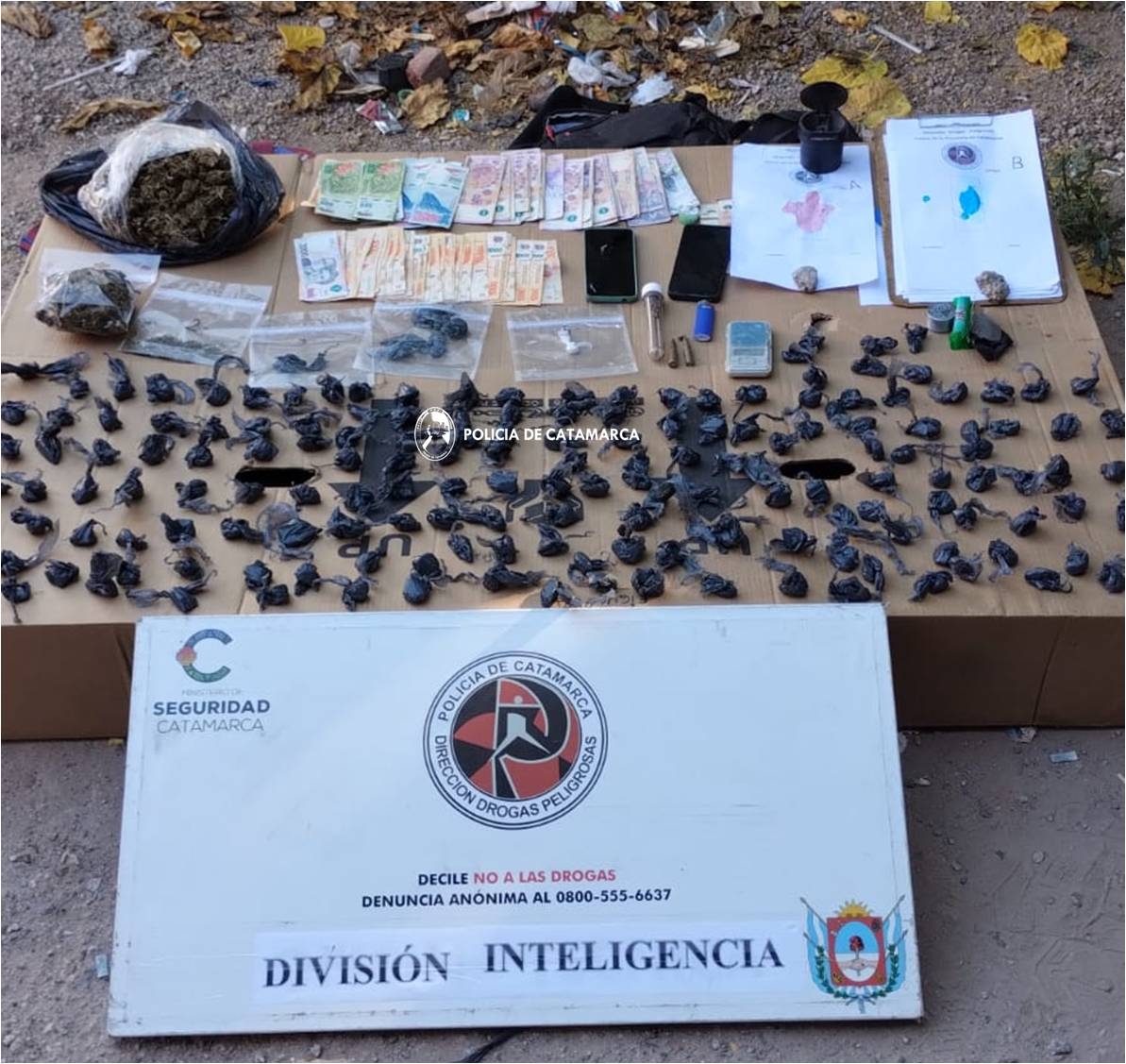 Tras irrumpir en los inmuebles, los policías encontraron ciento noventa (190) envoltorios de plástico que contenían una sustancia herbácea y tipo polvo de color blanco respectivamente, que al ser sometidos a la prueba de campo correspondiente, arrojó como resultado que se trataría de Marihuana y Cocaína, apta para preparar unas 3.922 dosis, que quedaron en calidad de secuestro, al igual que quinientas doce (512) semillas de la variedad Cannabis Sativa, una (01) pistola Bersa, calibre 22 mm., un (01) revolver, cincuenta y siete (57) cartuchos de distintos calibres, dos (02) balanzas digitales tipo gramera, una (01) motocicleta Honda CG 150 cc., de colores azul y blanco, ocho (08) teléfonos celulares de diferentes marcas y modelos, la suma de cincuenta y cinco mil pesos ($55.000) en efectivo, un (01) picador de metal, un (01) armador de cigarrillos, papel de seda y recortes de plástico.