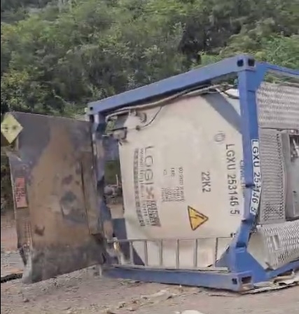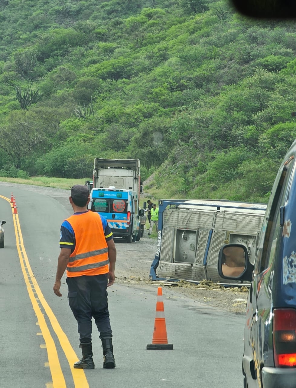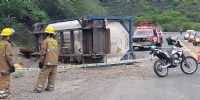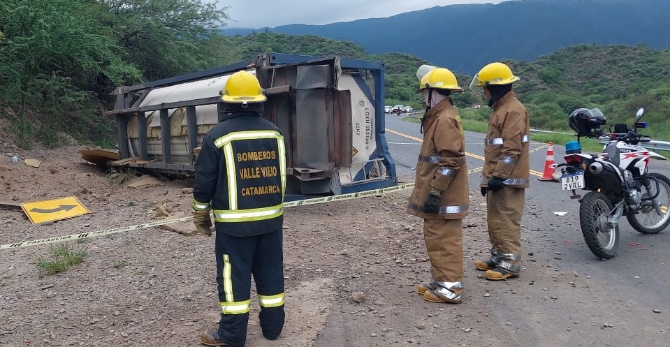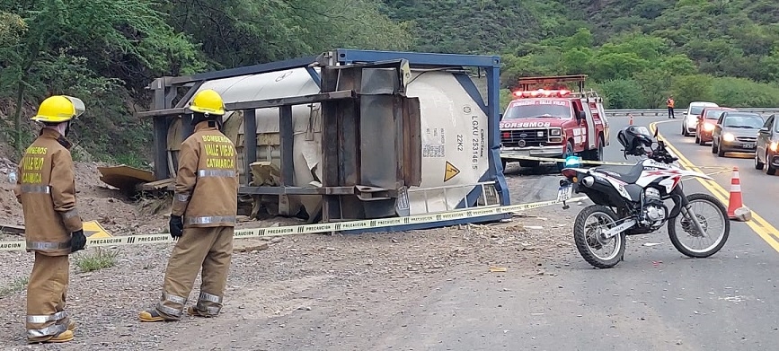 A metros del ingreso a Valle Viejo desde El Portezuelo, en el sector donde se encuentra la imagen de la Virgen del Valle y la entrada de Santa Cruz, un camión volcó su carga al desprenderse el container que transportaba sulfato de armonio líquido. Afortunadamente, el contenedor cayó a la ruta pero sin registrarse roturas en el tanque que transportaba el líquido.