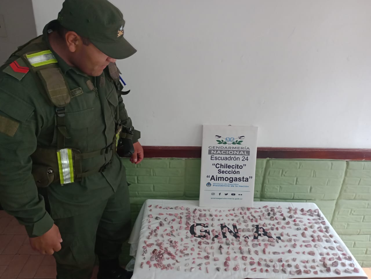 Los funcionarios tomaron contacto con el Juzgado Federal de La Rioja, quien orientó se interdicten las cajas y se proceda ante la presencia de testigos a la apertura de las mismas. Al dar cumplimiento a lo dispuesto por el Magistrado, los gendarmes contabilizaron un total de 560 piedras semipreciosas del mineral rodocrosita en infracción a la Ley 24.585 del Código de Minería.