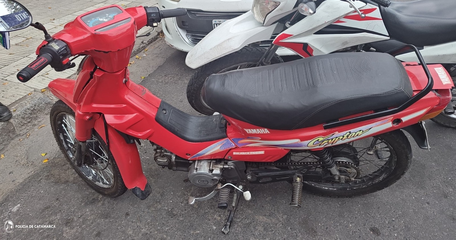 Hoy, a las 12:00, en la calle Tucumán, entre San Martín y República, numerarios de la Seccional Cuarta controlaron una motocicleta Yamaha Crypton 110 cc., de color rojo, en la que circulaba un hombre de 30 años de edad.