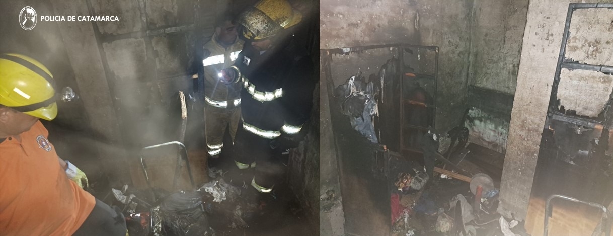 Una vez en el lugar, los policías constataron que, por causas que se investigan, el foco ígneo se habría originado en una de las habitaciones de la vivienda, propiedad de un hombre de 63 años de edad, por lo que de inmediato solicitaron la presencia de personal de Bomberos Voluntarios y Defensa Civil, que realizó tareas de su especialidad y logró sofocar las llamas que causaron daños materiales totales.