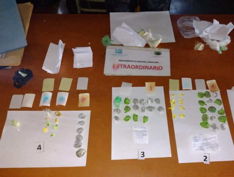 Por otra parte, en el Complejo Penitenciario Federal III de Salta, mediante un procedimiento de inspección y registro realizado al reintegro de internos procedentes del salón de visitas, se hallaron sustancias psicoactivas (marihuana, cocaína y pastillas picadas) ocultas en la ropa que vestía uno de los presos.