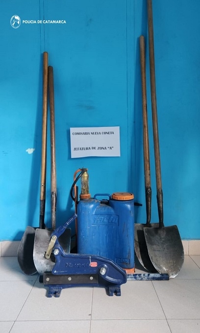 Tras averiguaciones practicadas, efectivos de la Seccional mencionada, conjuntamente con sus pares de la División de Investigaciones de la Policía de la Provincia, realizaron rastrillajes por la zona y lograron recuperar 5 palas, 1 guillotina y 1 mochila fumigadora azul, que estaban ocultas entre la maleza existente en el lugar.