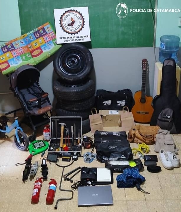 Durante el procedimiento, secuestraron una guitarra, cinco ruedas para automóviles de distintos rodados, una notebook con cargador y mouse, dos mini compresores, cuatro kits de seguridad para automóviles, dos gatos con sus respectivas llaves, una caja de herramientas completa, dos bolsos con distintos elementos reflextivos, dos medidores de distancia láser, una caja con gran cantidad de perfumes y cremas, un GPS marca Garmin, una bicicleta para niños, un matafuego, cuatro tazas para ruedas de vehículos, cuatro teléfonos celulares, $159.330 en efectivo, 200 dólares, un coche para bebé, una paleta de pádel, un parasol, una alfombra para niños y un Fiat Siena de color negro.
