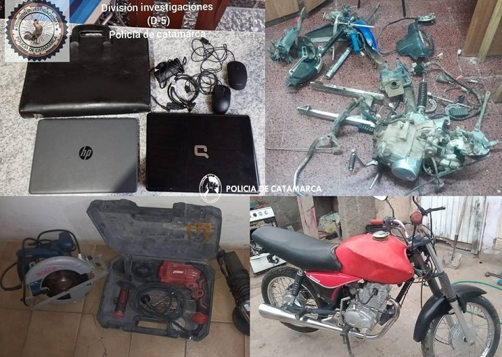 Al finalizar con las medidas Judiciales, los policías lograron recuperar una motocicleta Motomel S2 150 cc., de color naranja; dos notebook y mouse de colores gris y negro, con sus respectivos cargadores; una sierra circular verde marca Bosch; un taladro percutor Omaha rojo; una amoladora de mano angular marca Skill de colores gris y negro; un maletín de cuero negro, y varias motopartes, que quedaron en calidad de secuestro a disposicion de la Justicia interviniente.