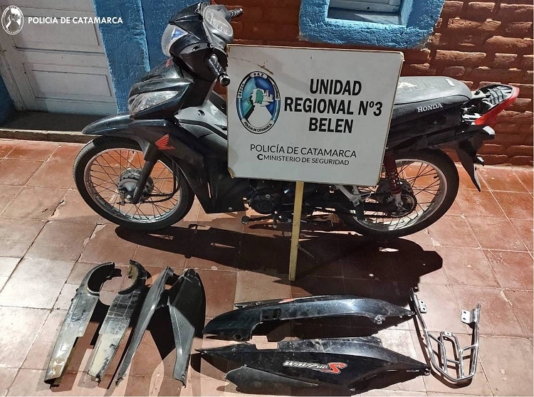 El rodado estaba oculto entre la maleza del lugar, por lo que quedó en calidad de secuestro, al igual que plásticos laterales, un cubre cadenas y un porta equipaje de motocicleta, que fueron encontrados en el ingreso al barrio Las Lomas de Belén y serían partes del rodado incautado.