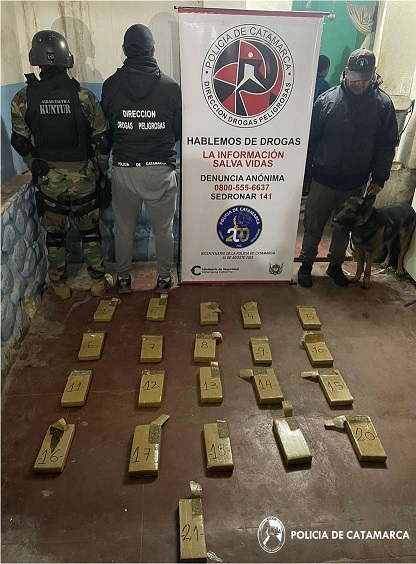 Al irrumpir en la vivienda, los investigadores encontraron 21 panes de formato rectangular tipo ladrillo, embalados con cinta marrón, que contenían en su interior una sustancia tipo herbácea, que al ser sometida a la prueba de campo correspondiente, arrojó como resultado que se trataba de 21 Kg., de Marihuana.