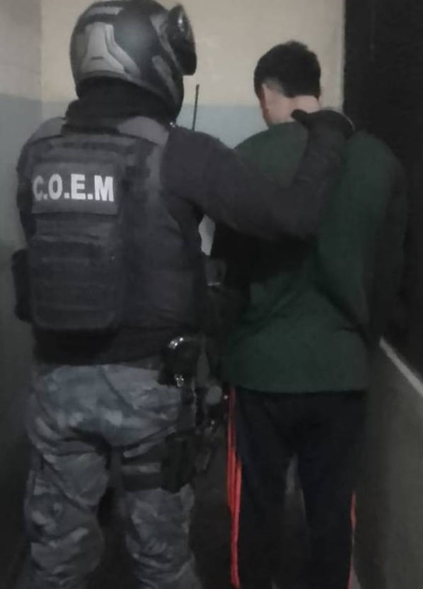 Con esta información, minutos después, en la esquina de avenida Dr. Deodoro Maza y calle Caleta Olivia, efectivos de la Seccional Novena y del GIR-Sur procedieron al secuestro del rodado, en tanto que los ocupantes del vehículo continuaron la huida a pie, ingresando a un domicilio ubicado en la calle Dr. Teodulfo Barrionuevo al 700, donde fue aprehendido uno de los presuntos autores de apellido Soraire (27), siendo interceptado por motoristas del COEM-Kappa.
