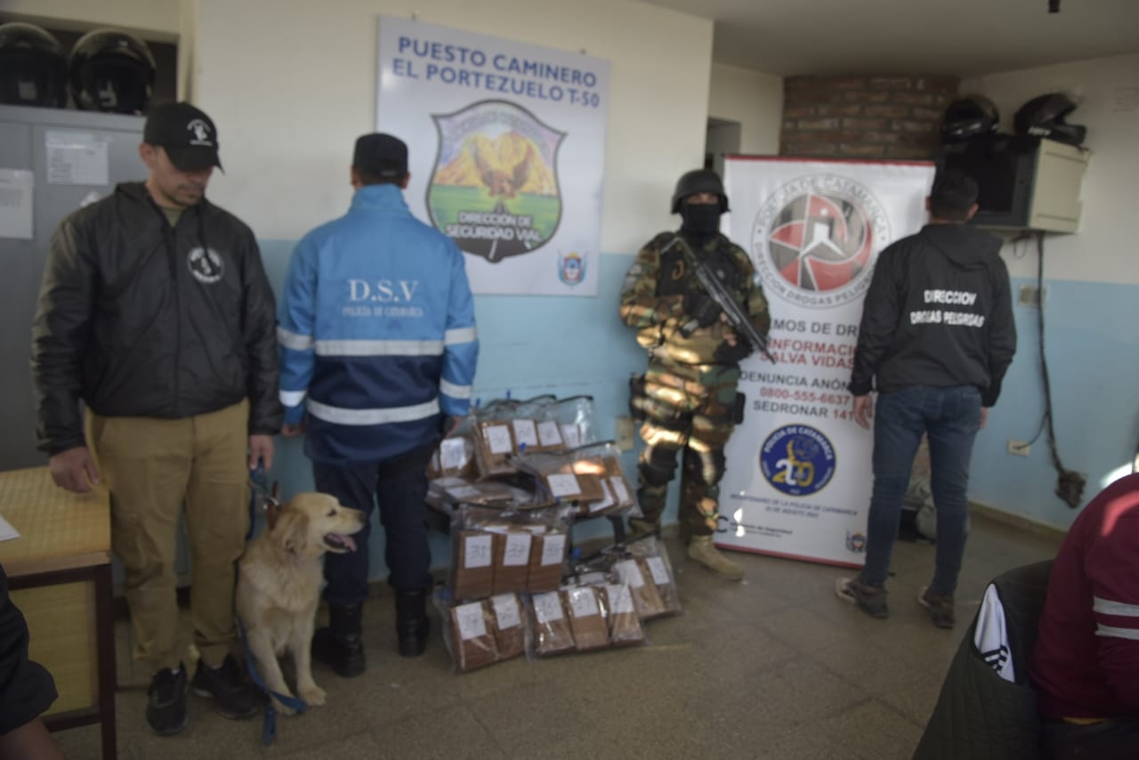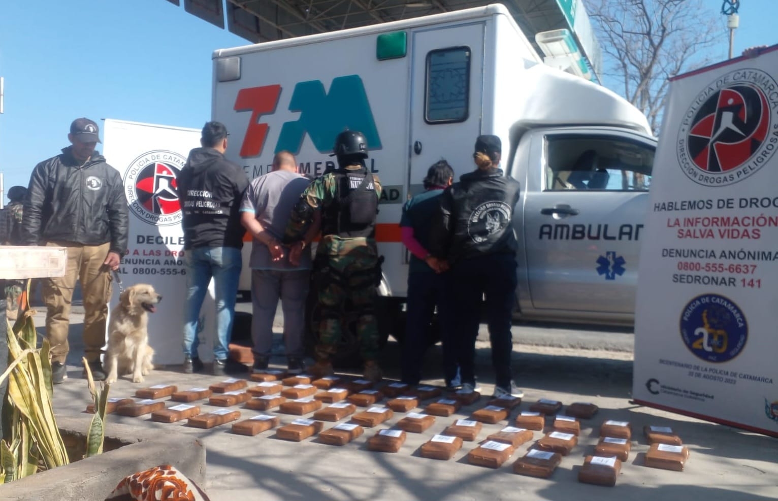 Pasado el mediodía de hoy, a las 12:30, en un operativo rutinario en el puesto caminero El Portezuelo del Departamento Valle Viejo, efectivos de las Direcciones Seguridad Vial y Drogas Peligrosas de la Policía de la Provincia identificaron a tres personas, dos hombres y una mujer, quienes circulaban en una ambulancia de una empresa privada, proveniente de la Provincia de Salta.