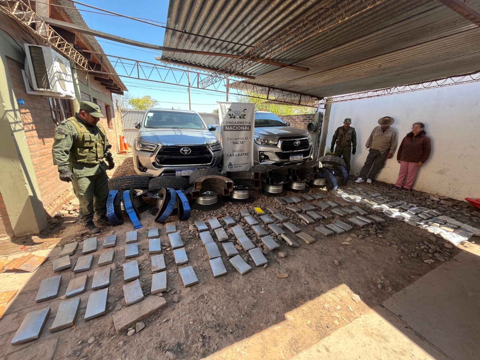 Fue durante un control sobre la Ruta Provincial N° 5, a la altura de la localidad de General Pizarro, donde descubrimos que dos camionetas transportaban más de 110 kilos de cocaína. Durante la inspección de los vehículos, los uniformados notaron irregularidades en la calibración de los neumáticos, los cuales presentaban exceso de aire.
