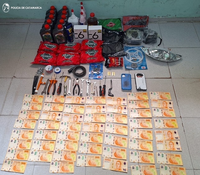 En dichos lugares, los policías lograron recuperar diversos repuestos de motocicleta, herramientas varias y la suma de $53.000 en efectivo, que quedaron en calidad de secuestro, al igual que un teléfono celular.