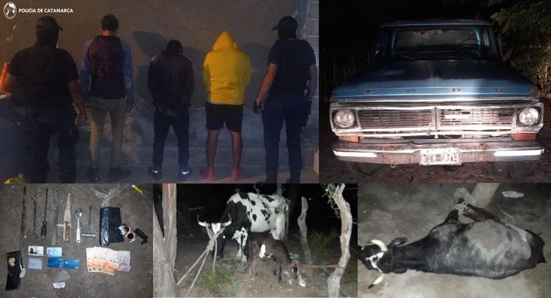 Hoy, a la 01:10, personal de la Comisaría de Saujil llegó hasta el barrio Santa Rosa de Lima, de esa localidad del Departamento Pomán, donde procedió al arresto en averiguación del hecho de tres personas del sexo masculino de apellidos Centeno (19), Ortega (24) y Toledo (28), quienes circulaban en una camioneta Ford F-100, de color azul, y habrían sido sorprendidas con tres animales vacunos, que aparentemente habían sido descargados en ese momento y serían producto de un ilícito, en virtud de lo cual quedaron en calidad de secuestro, al igual que un (01) cuchillo, herramientas, dinero en efectivo y documentación varia.