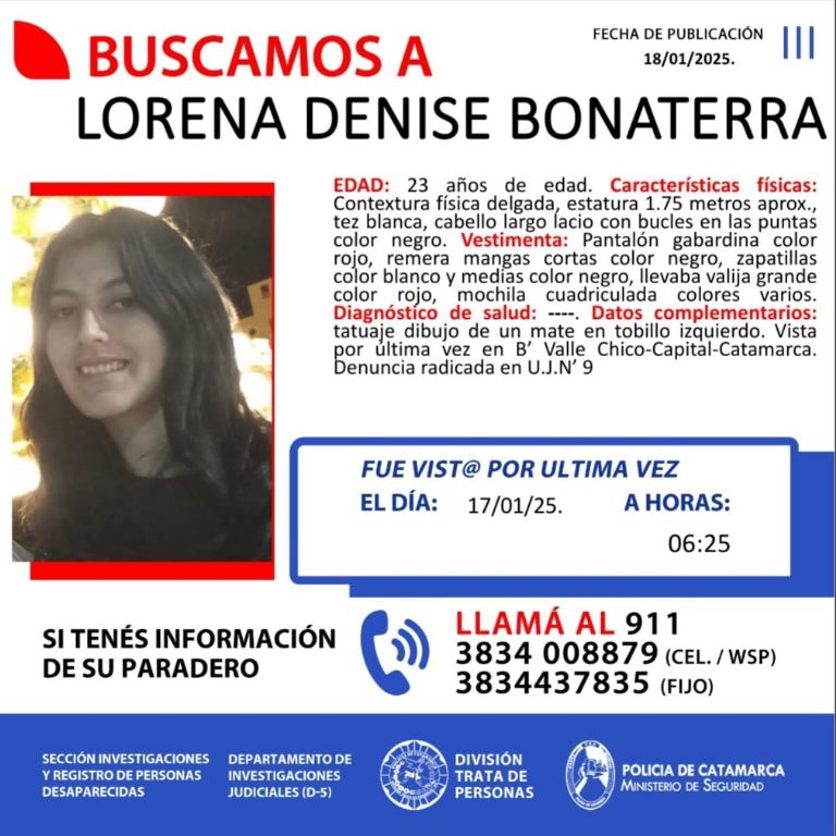 Se trata de Lorena Denise Bonaterra de 23 años que fue vista por última vez el 17 de enero en Valle Chico a las 6 de la mañana.