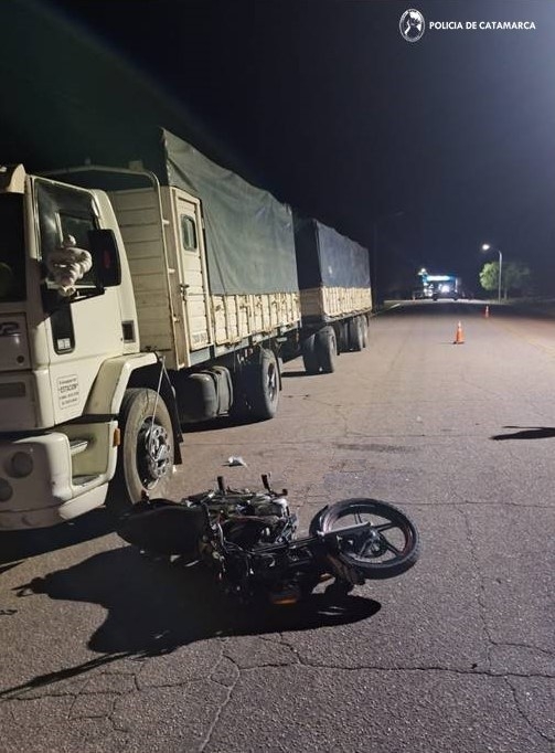 A las 03:20 de hoy, en avenida Illia, a la altura del ingreso a la Ciudad de Tinogasta, José María Allolio (20), que circulaba en una Honda CG Titán negra 150 cc. perdió el control y chocó contra un camión Ford 1722 que estaba estacionado, al mando de Daniel Alberto D'onofrio (60), oriundo de Santiago del Estero.
