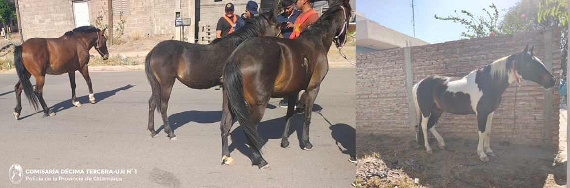 En distintos procedimientos, en la intersección de calles Polonia y Los Peregrinos, policías procedieron al secuestro de un equino que estaba suelto en el lugar atentando contra la seguridad vial. Por otra parte, en inmediaciones a calle Las Dalias, entre Francia y Polonia, el personal interviniente hizo lo propio con otros tres animales equinos.