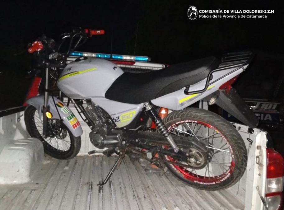 Hoy, a las 04:30, numerarios de la Comisaría de Villa Dolores llegaron hasta calle 25 de Agosto, frente a los locales de la Plaza El Aborigen, donde secuestraron una motocicleta Motomel S2 150 cc., de color gris con detalles de color verde, que estaba abandonada en el lugar.
