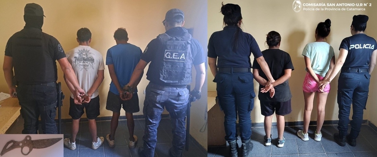 En el lugar, los policías secuestraron una cuchilla tipo daga, como así también arrestaron en averiguación del hecho a dos jóvenes de apellidos Meyer y Arica, de 23 años e hicieron lo propio con dos mujeres identificadas como Meyer (22) y Farías (42), debido a que fueron sindicados como los presuntos autores de haber agredido físicamente a un adolescente de 15 años y a otras dos personas.