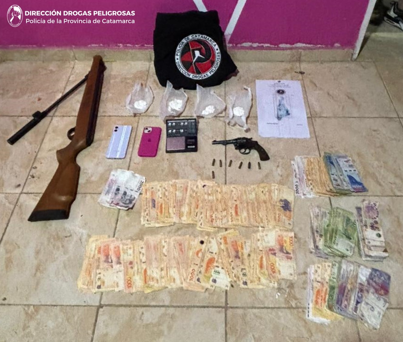 En el lugar, los policías incautaron varios envoltorios de plástico con cocaína, una (01) balanza digital, dos (02) teléfonos celulares; uno marca IPhone y el restante Samsung, un (01) revólver calibre .32 largo, un (01) rifle de aire comprimido, trescientos setenta y ocho mil setecientos ($378.700) pesos en efectivo y siete (07) cartuchos calibres 9 mm. y .32 mm.