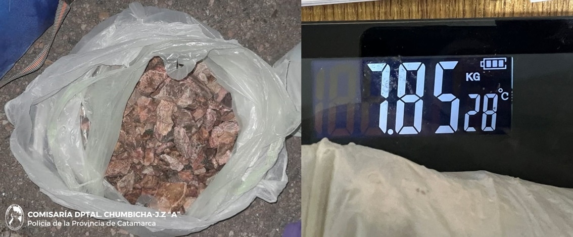 En ese momento, los uniformados se percataron que los ocupantes del rodado llevaban piedras rodocrosita, con un peso de 7,800 kilos, por lo que dieron intervención a la Fiscalía de Instrucción en turno del Distrito Sur, al Juzgado Federal y a la Policía Minera, desde donde ordenaron el secuestro de las piedras semipreciosas y que se labren las actuaciones de rigor.