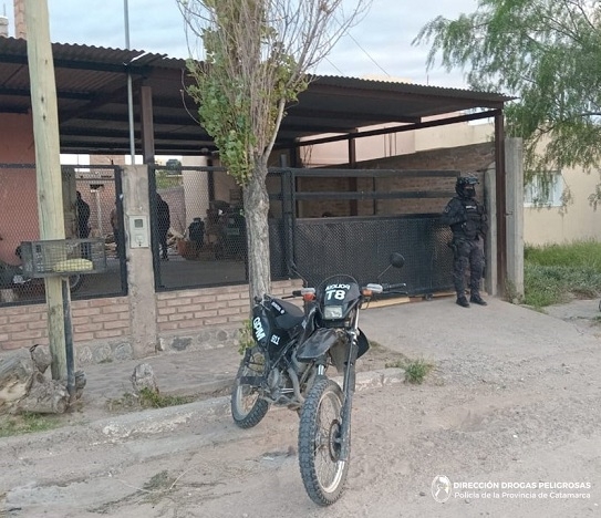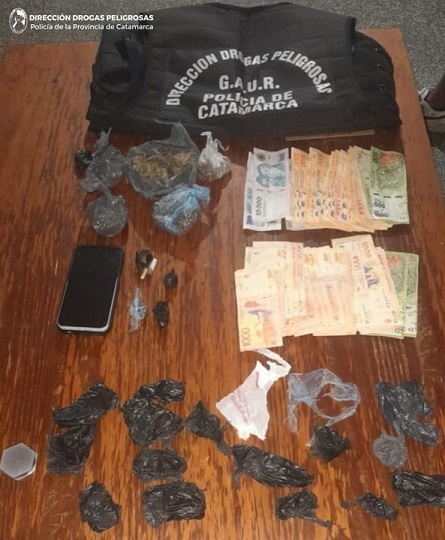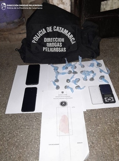 Más tarde, a las 20:00, personal del Grupo Antinarcóticos de Unidades Regionales (GAUR - Tinogasta), en un inmueble del Barrio 80 viviendas, ubicado en calle Ramón Sierralta, de esa Ciudad, bajo las directivas del Juzgado Federal, hizo lo propio e incautó 21 envoltorios de plástico de color lila, conteniendo una sustancia herbácea de color verde parduzco, compuesta por hojas tallos y semillas, que acusó un peso de 29 Gr. de probable Marihuana, dos teléfonos celulares, dinero en efectivo y una balanza tipo gramera