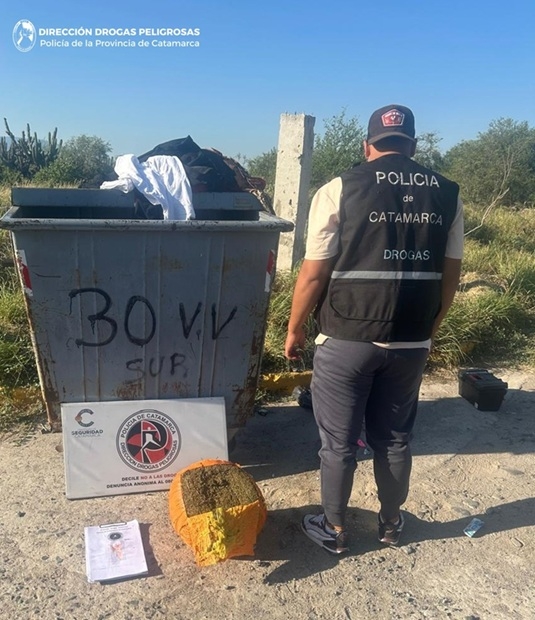 De la misma manera, tras una tarea de investigación, efectivos de esa Dirección llegaron hasta otro contenedor de residuos, ubicado en la esquina de las calles Peso de Ley y Peso Argentino, donde incautaron un paquete asegurado con cinta de color naranja, que en su interior contenía una sustancia herbácea compuesta por hojas, flores, tallos y semillas, que al ser sometida a la prueba de campo correspondiente arrojó resultado positivo para probable marihuana con un pesaje de 4,990 Kg.