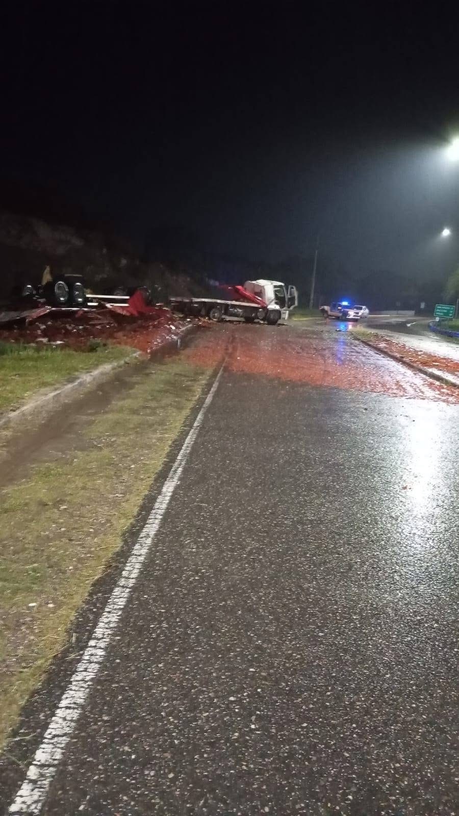 Un camión que transportaba ladrillos perdió el control, por causas que aún se investigan, y gran parte de su carga quedó esparcida sobre la calzada tras el vuelco del acoplado, generando riesgos en el tránsito.