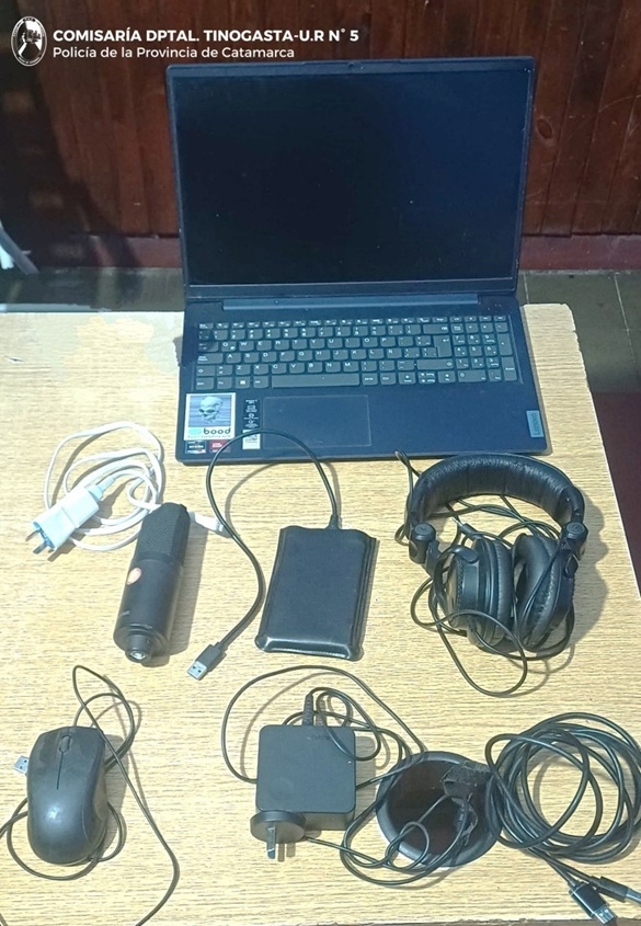 Hoy, a las 11:00, personal de la Comisaría de Tinogasta recuperó una notebook con su respectivo cargador, un micrófono inalámbrico, un auricular, un mouse verbatim, un cargador para celular con cable USB de iPhone y un disco externo, que serían producto de un ilícito en el que resultó damnificado un hombre mayor de edad, quien denunció el hecho.