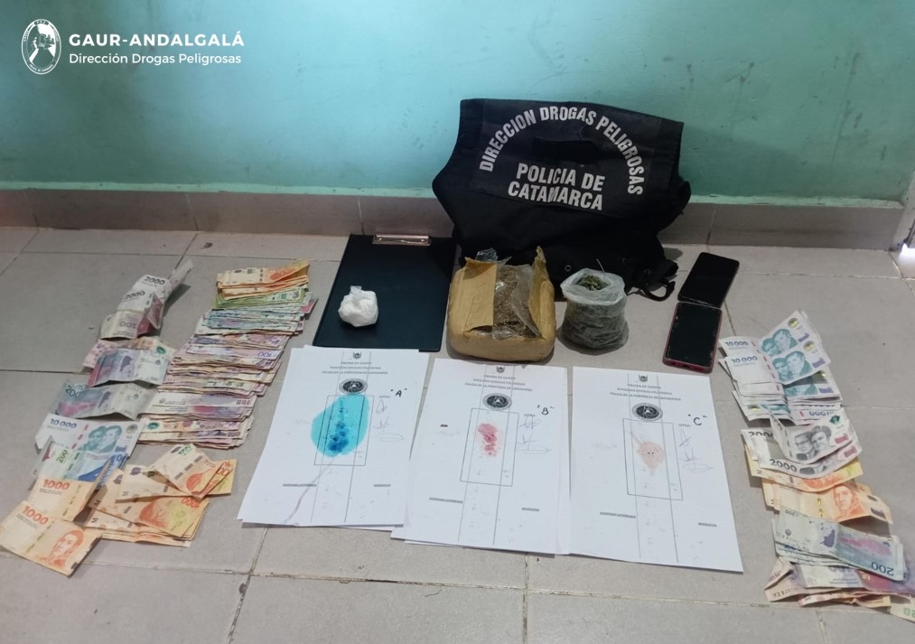 En el lugar, los investigadores secuestraron sustancias herbáceas y tipo polvo de color blanco, que al ser sometidas a la prueba de campo correspondiente arrojó como resultado que se tratarían de 1,057 Kg., de Marihuana y 101 Gr. de Cocaína respectivamente, como así también hicieron lo propio con un (01) sobre de papel madera que contenía en su interior Cogollos de Marihuana , al igual que incautaron dos (02) teléfonos celulares , ambos marca Samsung, la suma de doscientos diecisiete mil diez pesos ($217.010) en efectivo , y una motocicleta Honda Wave 110 cc.