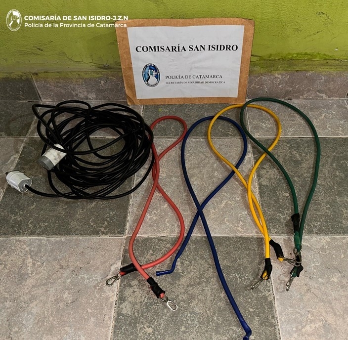 En la madrugada de hoy, a las 03:15, efectivos de la Comisaría de San Isidro se constituyeron en en inmediaciones al Camino de la Virgen, de esa localidad del Departamento Valle Viejo, donde aprehendieron a un joven de apellido Castro (21), quien habría sido sorprendido llevando un prolongador de corriente y cuatro (04) bandas elásticas para gimnasia, que estarían vinculados a un hecho ilícito, por lo que quedaron en calidad de secuestro.
