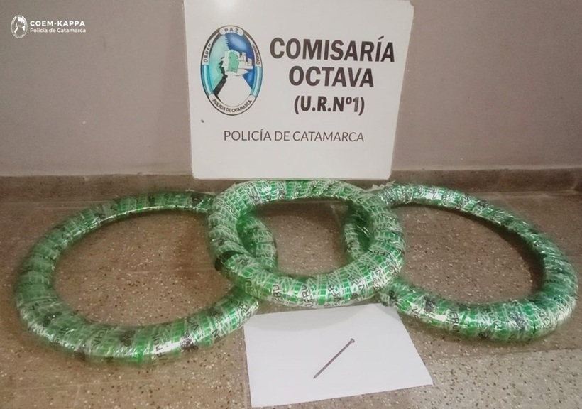 Continuando con las tareas investigativas, los efectivos llegaron hasta la esquina de avenida Combatientes de Malvinas y calle Santa Inés, donde lograron recuperar las cubiertas sustraídas, que también fueron incautadas.
