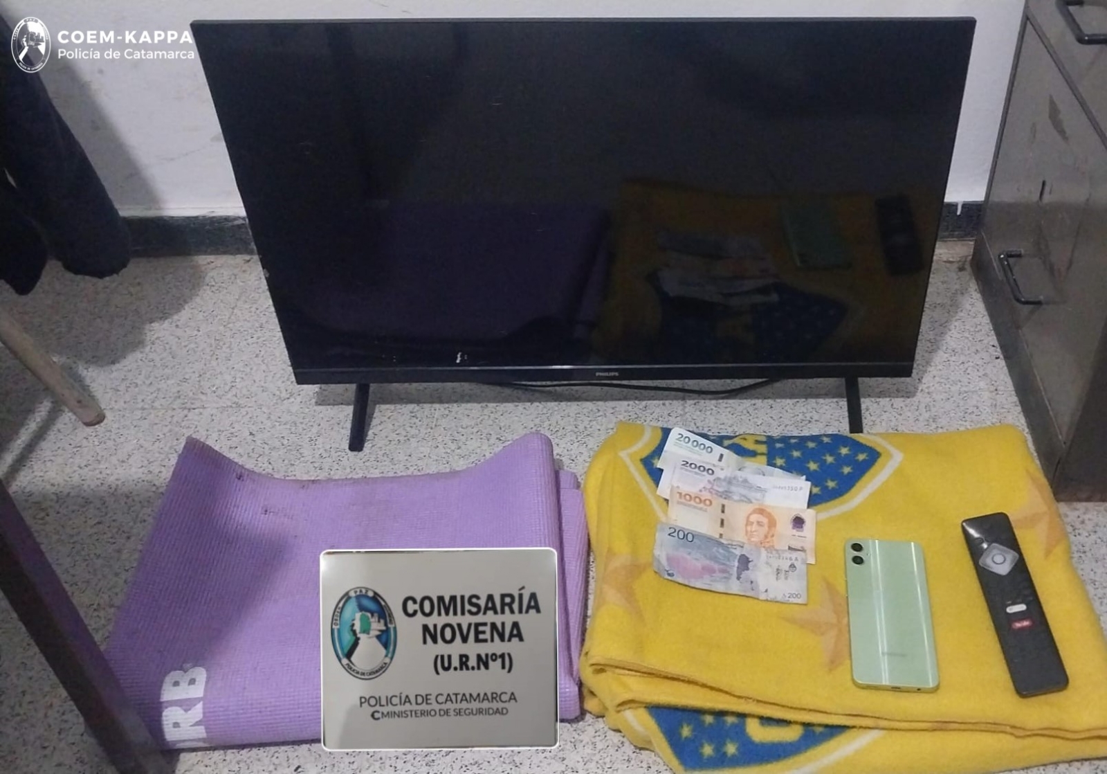 Tras la denuncia, en un operativo desplegado en la esquina de avenida Amatista y calle San Juan, efectivos policiales lograron aprehender a los presuntos autores del hecho, dos hombres de 34 años, de apellidos Rodríguez y Acosta. Además, los policías recuperaron un televisor de 32 pulgadas, un teléfono celular, una lona, una colcha y la suma de $23.200 en efectivo, elementos que quedaron secuestrados para la causa.