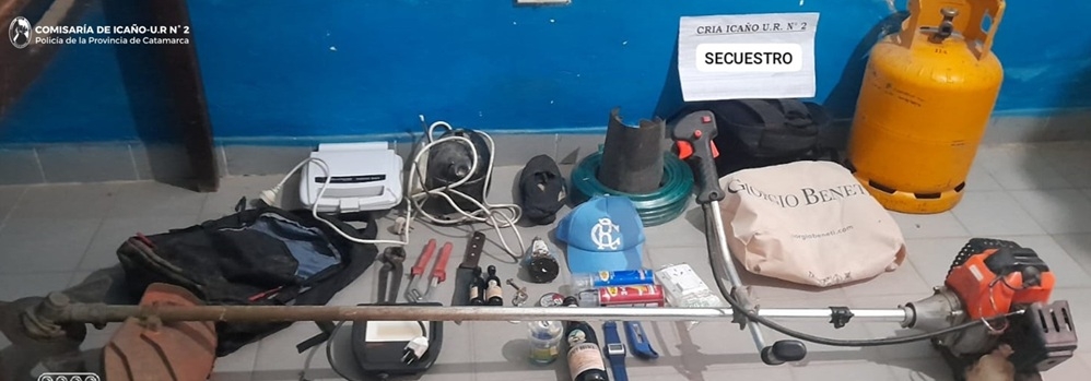 Se trata de una garrafa de gas de 10 Kg., una motoguadaña, un motor de heladera, una wafflera, un rollo de manguera, un proyector, dos mochilas escolares, bebidas alcohólicas y otros elementos, que habrían sido sustraídos de una finca ubicada en la Ruta Provincial N° 7.