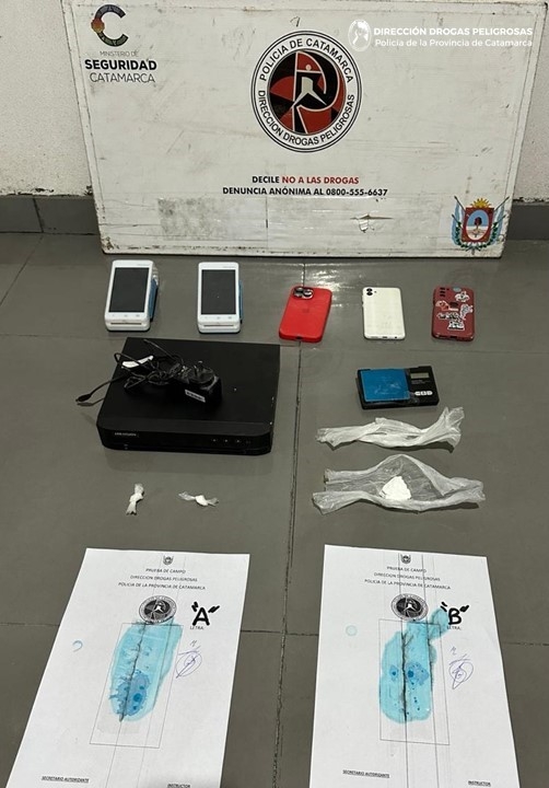 Al irrumpir en los inmuebles y bajo las directivas del Juzgado Federal, los policías secuestraron varios envoltorios de plástico que en su interior contenían sustancias herbácea y tipo polvo de color blanco, que al ser sometidas a la prueba de campo correspondiente arrojaron como resultado que se tratarían de Marihuana y Cocaína respectivamente, listas para su comercialización, como así también incautaron una (01) balanza de precisión, un (01) DVR, dos (02) Point Smart de la empresa Mercado Pago y cuatro (04) teléfonos celulares de distintas marcas y modelos.