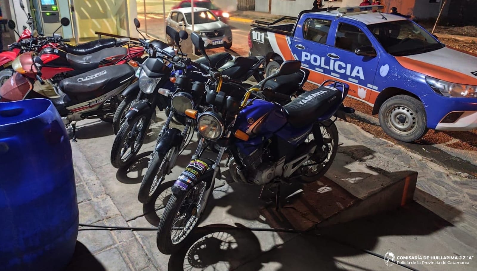 Ayer, personal de la Comisaría de Huillapima llevó a cabo un operativo de control vehicular en distintos puntos estratégicos de esa localidad del Departamento Capayán, donde al finalizar secuestró siete (07) motocicletas de distintas marcas y cilindradas, debido a que sus conductores infringieran lo normado en la Ley Nacional de Tránsito N° 24.449.