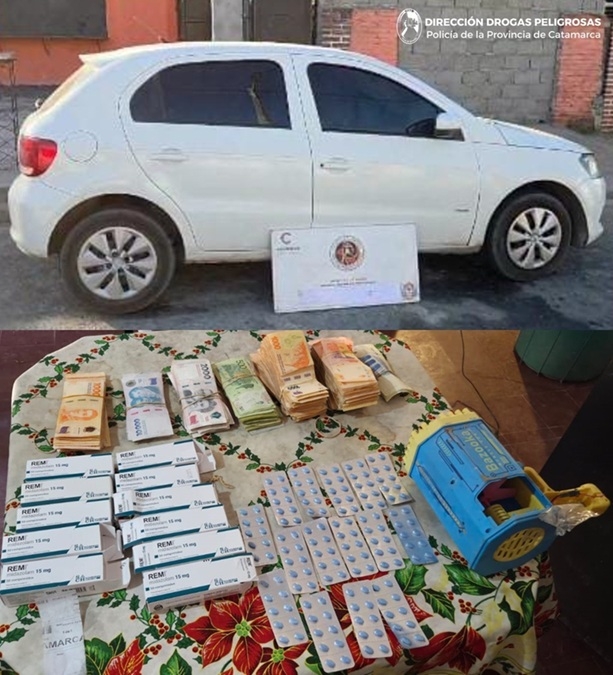 Al irrumpir en el inmueble, los policías encontraron una pistola de burbujas de juguete, que en su interior contenía 150 comprimidos de Rem Midazolam 15 Mg., que quedaron en calidad de secuestro, al igual que una Play Station 5, un parlante musical Philips, dos televisores de 65’ pulgadas, un teléfono celular iPhone 13, un automóvil Volkswagen Gol Trend blanco y la suma de $1.800.000.
