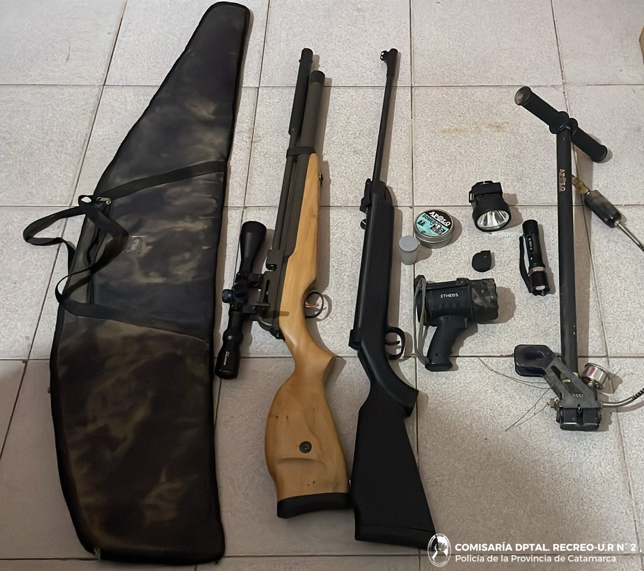 A las 22:30 de la noche de ayer, personal de la Comisaría Departamental Recreo se constituyó en el barrio Parcela Sur, de esa Ciudad del Departamento La Paz, donde habría sorprendido a dos personas del sexo masculino cuando llevaban dos (02) rifles de aire comprimido marcas J Murrieta y SEAT, calibres 6.35 y 5.5 mm., respectivamente, sin la documentación correspondiente, por lo que quedaron en calidad de secuestro, al igual que otros elementos.