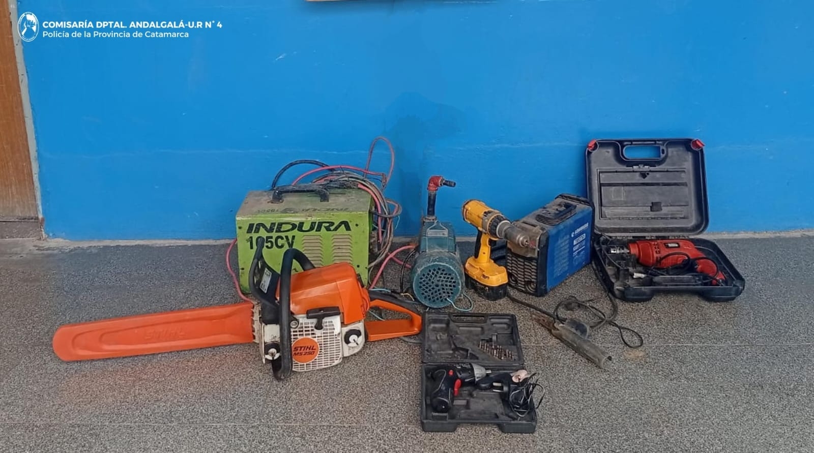 A raíz de denuncias penales radicadas por dos personas de ambos sexos mayores de edad, quienes manifestaron que habrían sido víctimas de ilícitos, tras averiguaciones practicadas, efectivos de la Comisaría Departamental Andalgalá, con colaboración de personal de calle de la Unidad Regional N° 4, materializaron un registro domiciliario en el Distrito La Aguada, donde recuperaron una (01) soldadora, una (01) bomba de agua y un (01) atornillador, que quedaron en calidad de secuestro, al igual que una (01) amoladora marca Skil, de color amarillo.