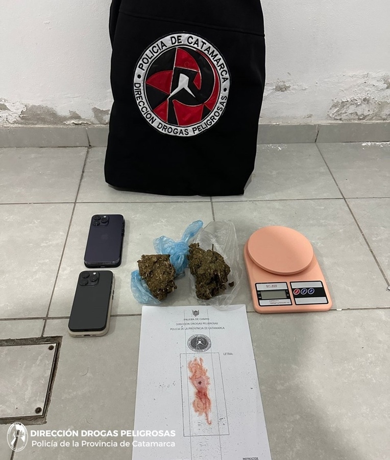 Al irrumpir en la vivienda, los investigadores secuestraron dos envoltorios de plástico con una sustancia herbácea compuesta por hojas, flores y tallos, que al ser sometida a la prueba de campo correspondiente, arrojó como resultado que se trataban de 251 Gr. de Marihuana, como así también incautaron una balanza digital tipo gramera, dos teléfonos celulares, ambos marca iPhone y un automóvil Volkswagen Bora.