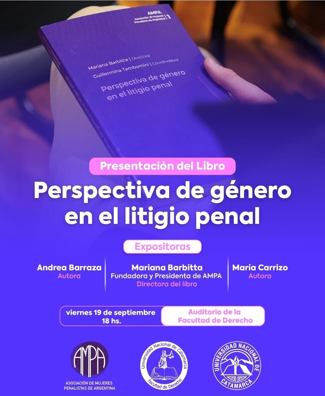 Este viernes 19 de septiembre, a las 18 horas, en el Auditorio de la Facultad de Derecho de la Universidad Nacional de Catamarca, se llevará a cabo la presentación del libro “Perspectiva de género en el litigio penal”.