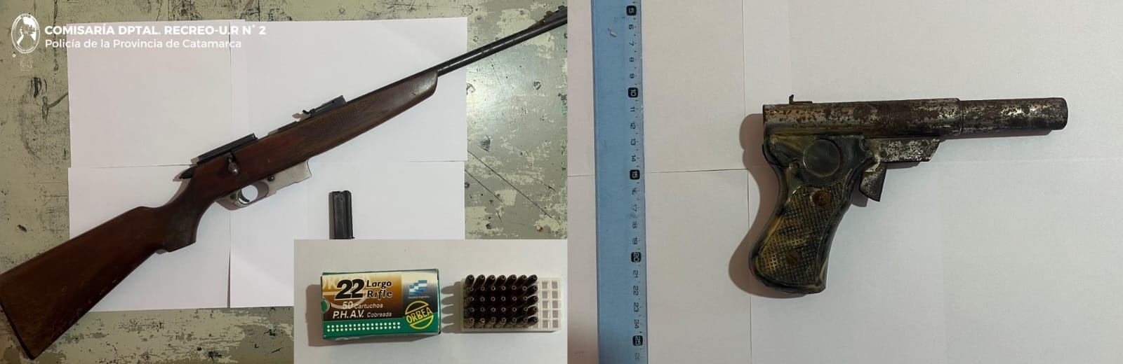 En los lugares, los policías secuestraron un (01) rifle calibre 22 largo, con su respectivo cargador, cinco (05) cuchillos tipo puñales, una (01) pistola de fabricación casera y una (01) caja con treinta y cinco (35) cartuchos calibre 22, que fueron puestos a disposición de la Fiscalía de la Sexta Circunscripción Judicial.