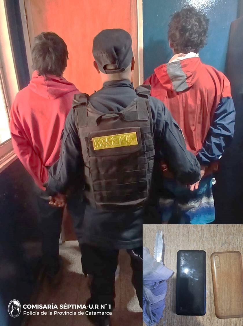 Ayer, en la intersección de avenida Choya y calle Antofalla, efectivos de la Seccional Séptima detuvieron a dos jóvenes, Ibáñez (19) y Navarro (26). Uno de ellos intentó deshacerse de un teléfono celular cuyo origen no pudo justificar, mientras que el otro agredió verbalmente y físicamente al personal policial. Se secuestró el celular y un objeto cortopunzante. Ambos fueron alojados a disposición de la Fiscalía de Instrucción del Distrito Norte.